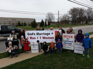 The rally was just beginning when I arrived. The rally captain and his family had set up with a large banner reading: “God’s Marriage = 1 Man + 1 Woman.” There were also hand signs, several of which encouraged people to honk for traditional marriage. As I came into the field of battle, there were already some people honking their support of the rally from the safety of their cars. Our extraordinary rally was already being photographed by passing cars and posted on countless Facebook pages.