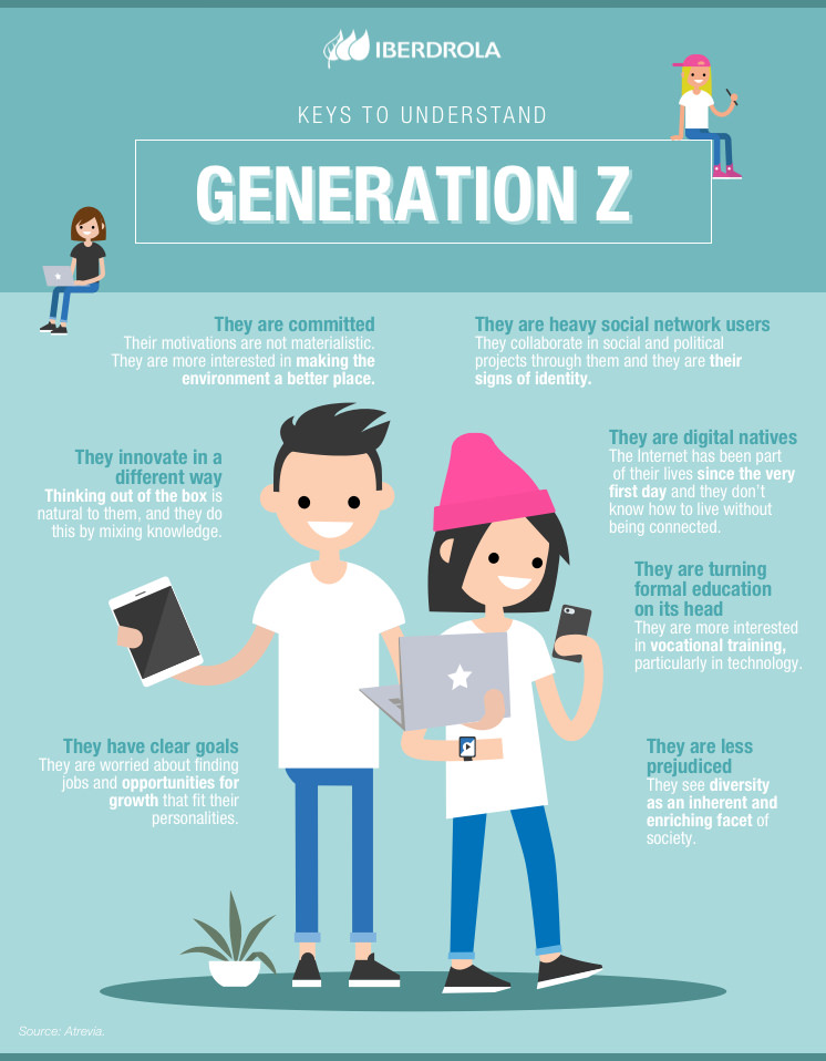 The poster claims that the members of Generation Z (or Gen Z) are “digital natives.” It explains, “The Internet has been part of their lives since the very first day, and they don’t know how to live without being connected.”